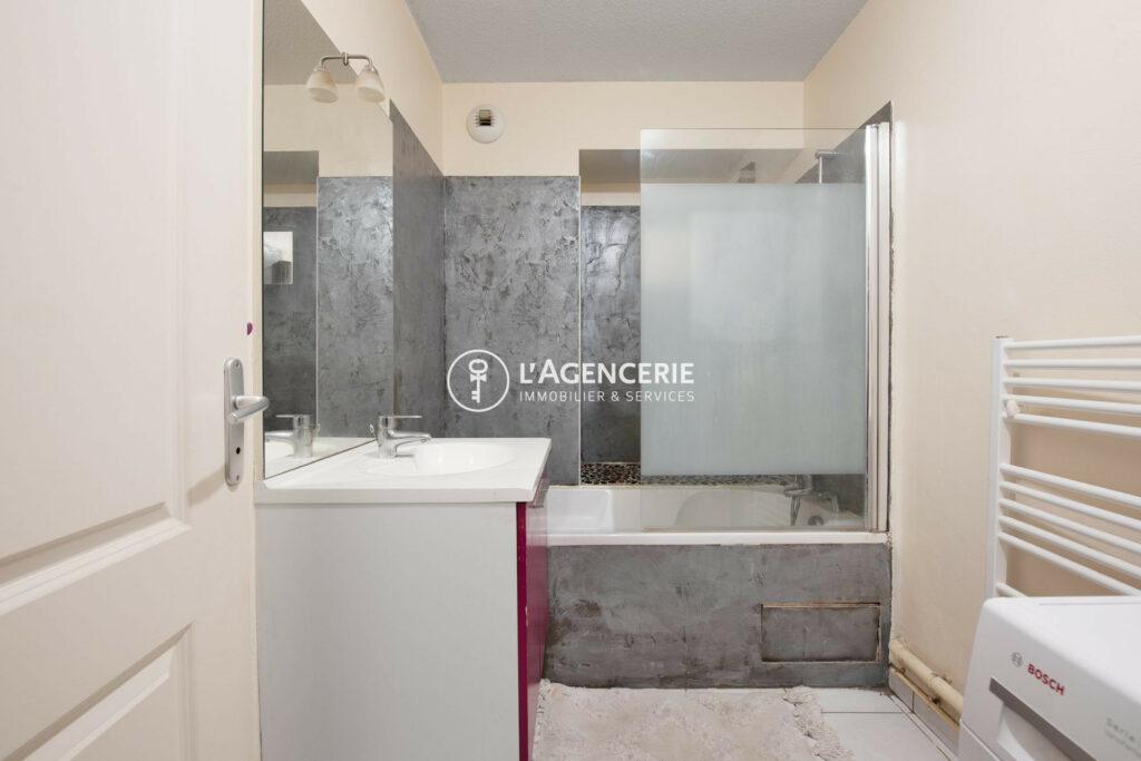 Enfin, une salle de bain avec son meuble vasque, son sèche serviette et un WC.