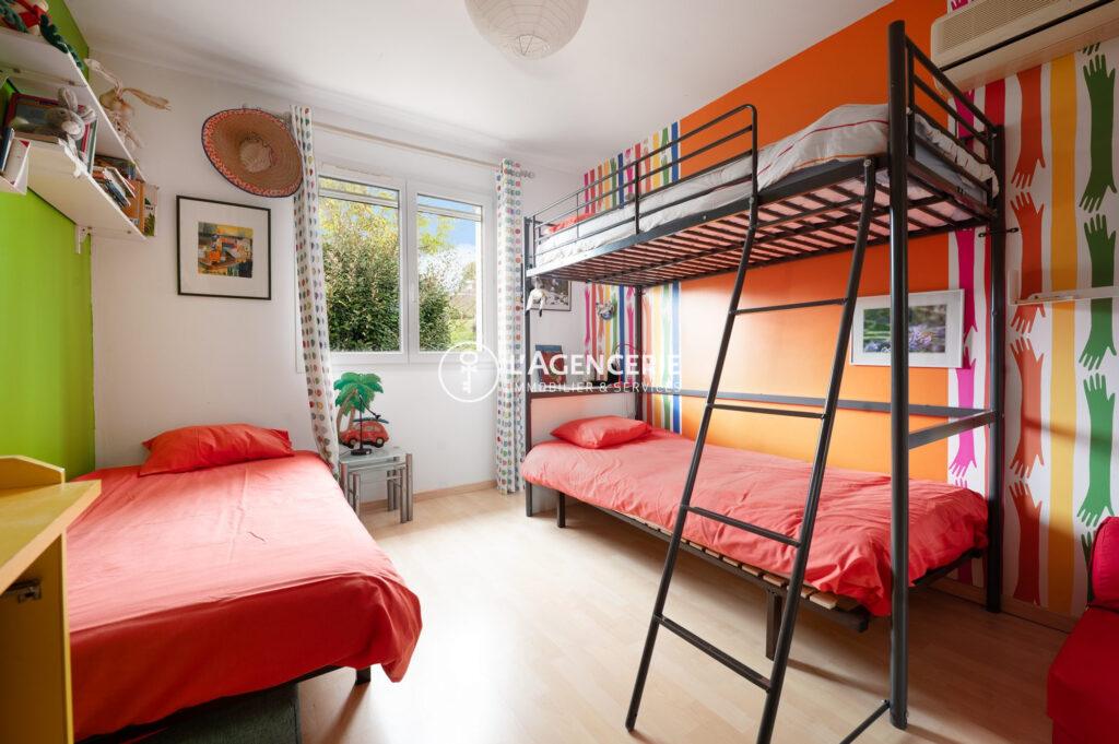À l’étage, deux chambres supplémentaires, lumineuses, se partagent une seconde salle de bains ainsi qu’un troisième WC, permettant une véritable autonomie pour toute la famille.