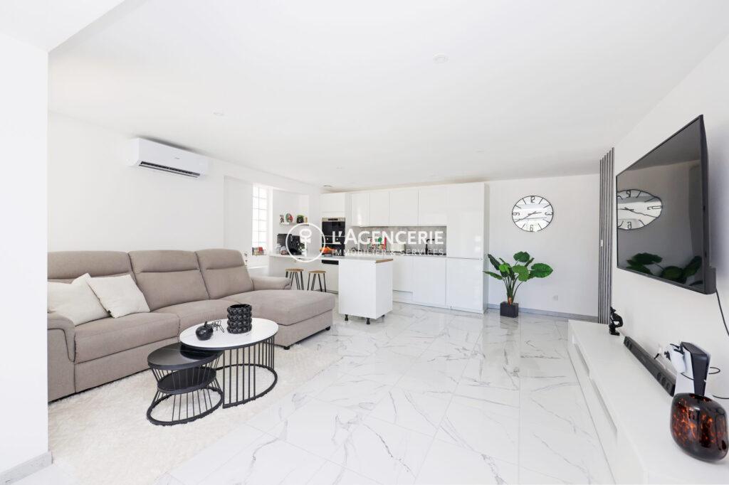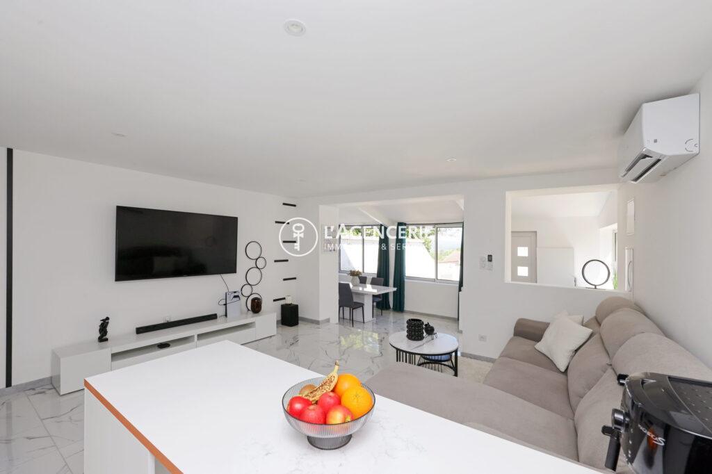 Dès l’entrée, vous découvrez une pièce de vie conviviale composée d’un espace salle à manger et d’un salon avec cuisine ouverte, entièrement aménagée et équipée, baignée de lumière naturelle. L’ensemble offre une atmosphère chaleureuse et fonctionnelle, idéale au quotidien.