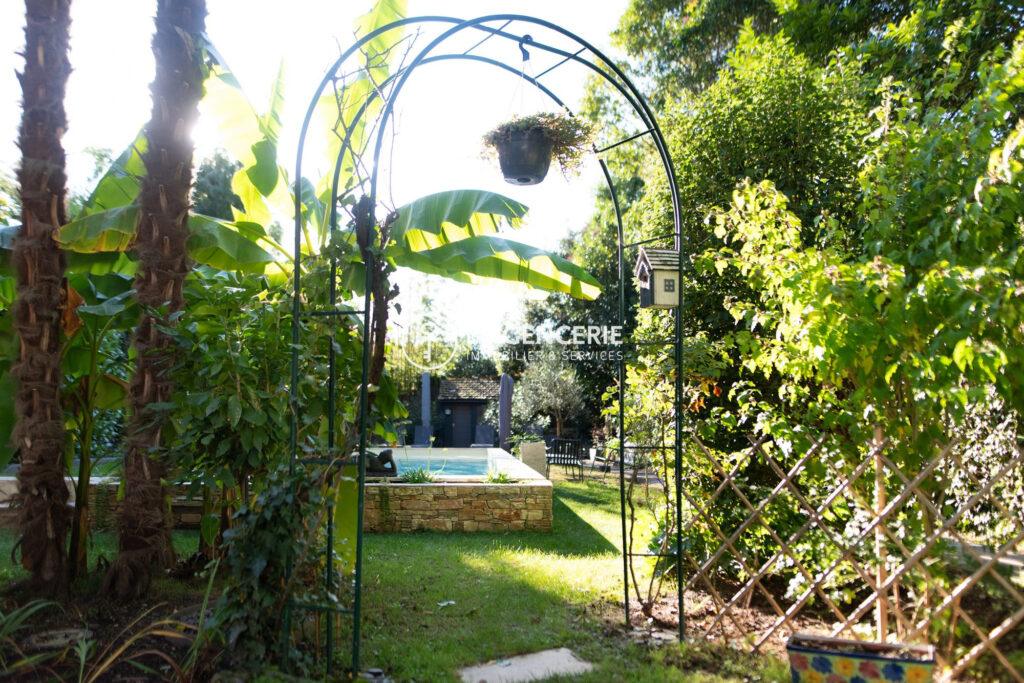 À l’extérieur, la terrasse avec cuisine d’été et la piscine de 10 x 3 mètres avec douche et local technique s’intègrent dans une parcelle clôturée et végétalisée de 794 m², offrant intimité et sérénité.