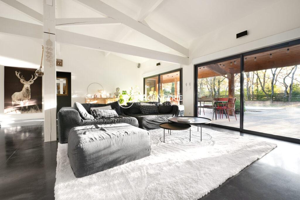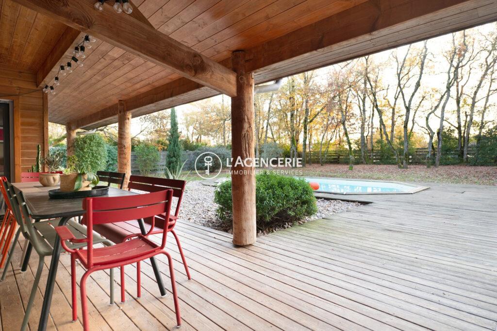 À l’extérieur, la maison profite d’une terrasse couverte de 40 m² donnant sur la piscine, ainsi qu’une terrasse suspendue de 20 m² à l’arrière, offrant une vue dégagée sur le bois.