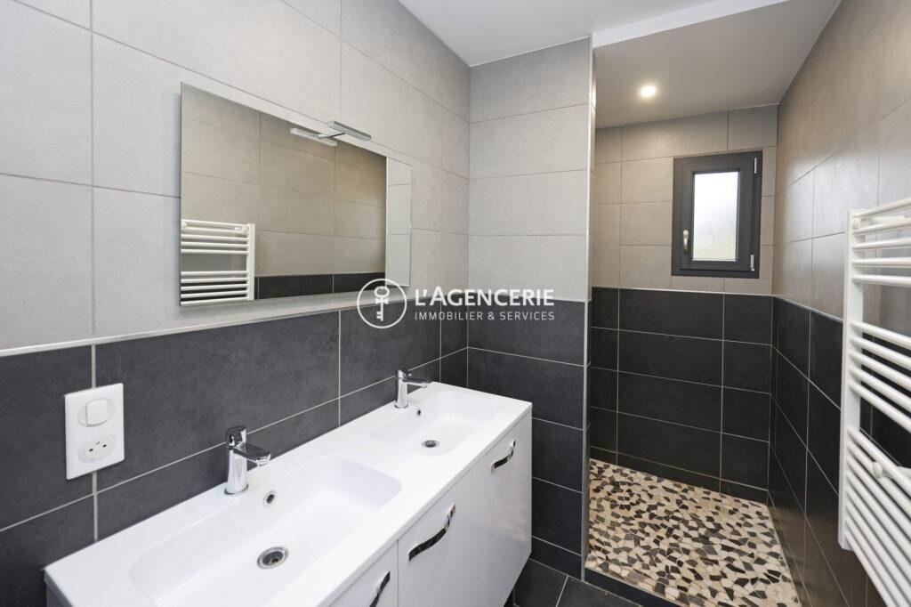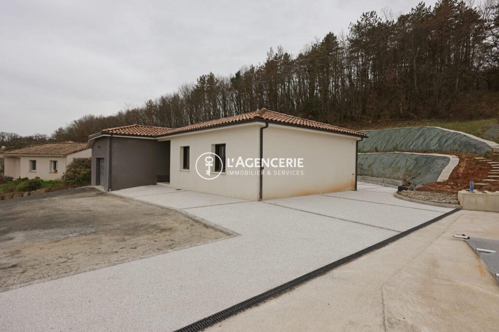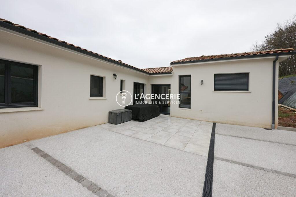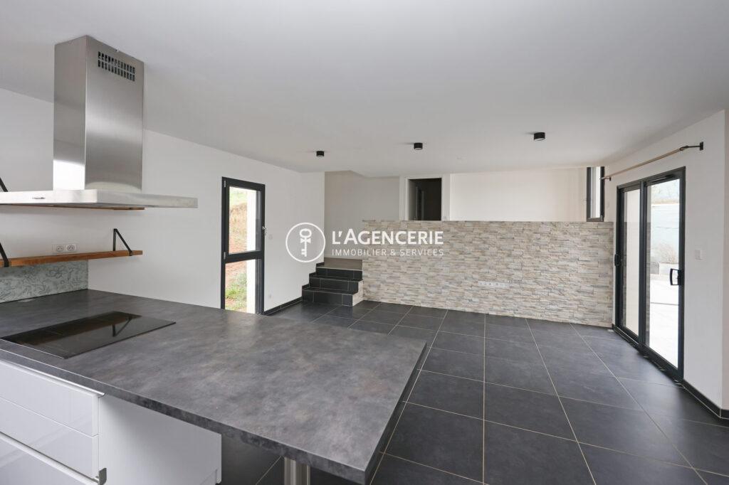 Cette maison récente de 120 m² habitables se compose d’une entrée ouverte sur la pièce de vie et la cuisine aménagée, le tout donnant sur la terrasse. Un premier côté nuit desservit par un palier pouvant servir de bureau ou bibliothèque donne accès à la suite parentale avec une salle d’eau et un dressing. Un second côté nuit avec trois chambres, une salle de bain et un toilette.