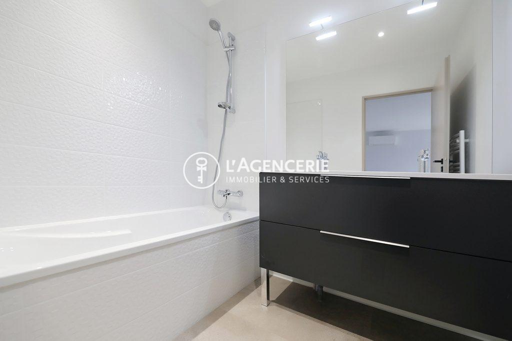 L’espace nuit se compose de deux chambres de 11 m² et 12 m², toutes deux équipées de placards de rangement. Une salle de bain avec baignoire et meuble double vasque ainsi qu’un WC séparé complètent l’agencement.