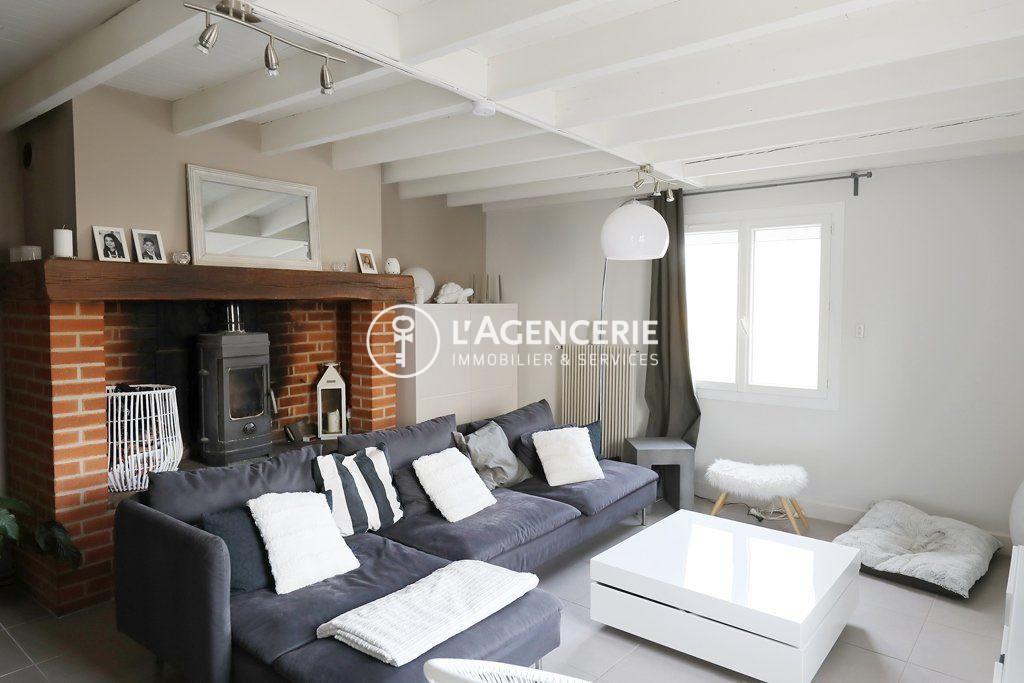 La maison s’ouvre sur une grande cuisine aménagée et équipée, dans son prolongement un salon cosy avec sa belle cheminée et son insert.