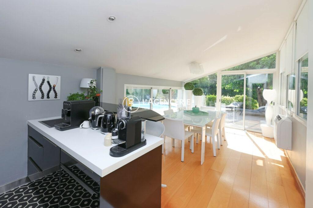 Une agréable salle à manger ouverte sur la terrasse et la piscine,