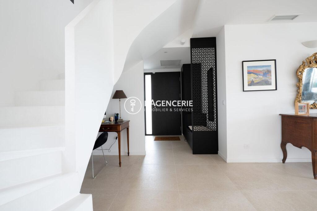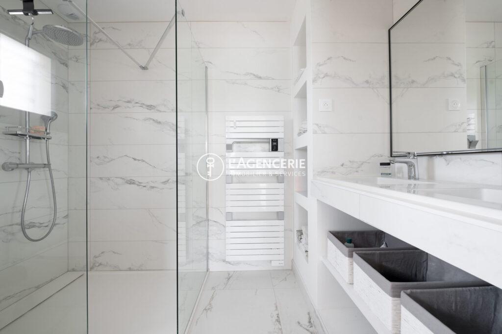 Le rez-de-chaussée abrite également une élégante suite parentale, dotée d’un dressing et d’une salle d’eau avec WC. Un escalier contemporain, véritable élément architectural, structure l’espace tout en offrant un coin bureau judicieusement aménagé.